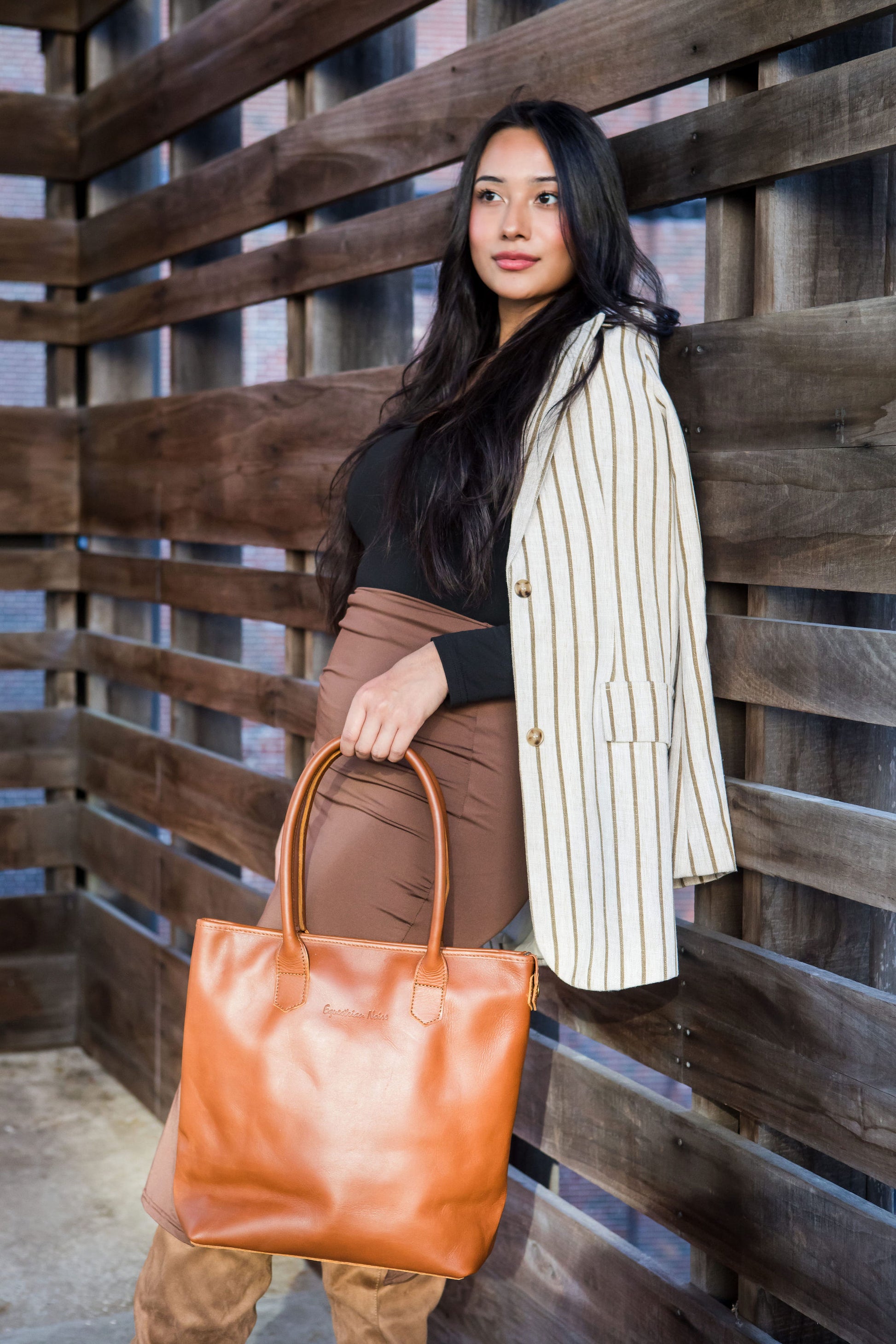 Woman holding the Wellington Tote in espresso against a textured gray background
